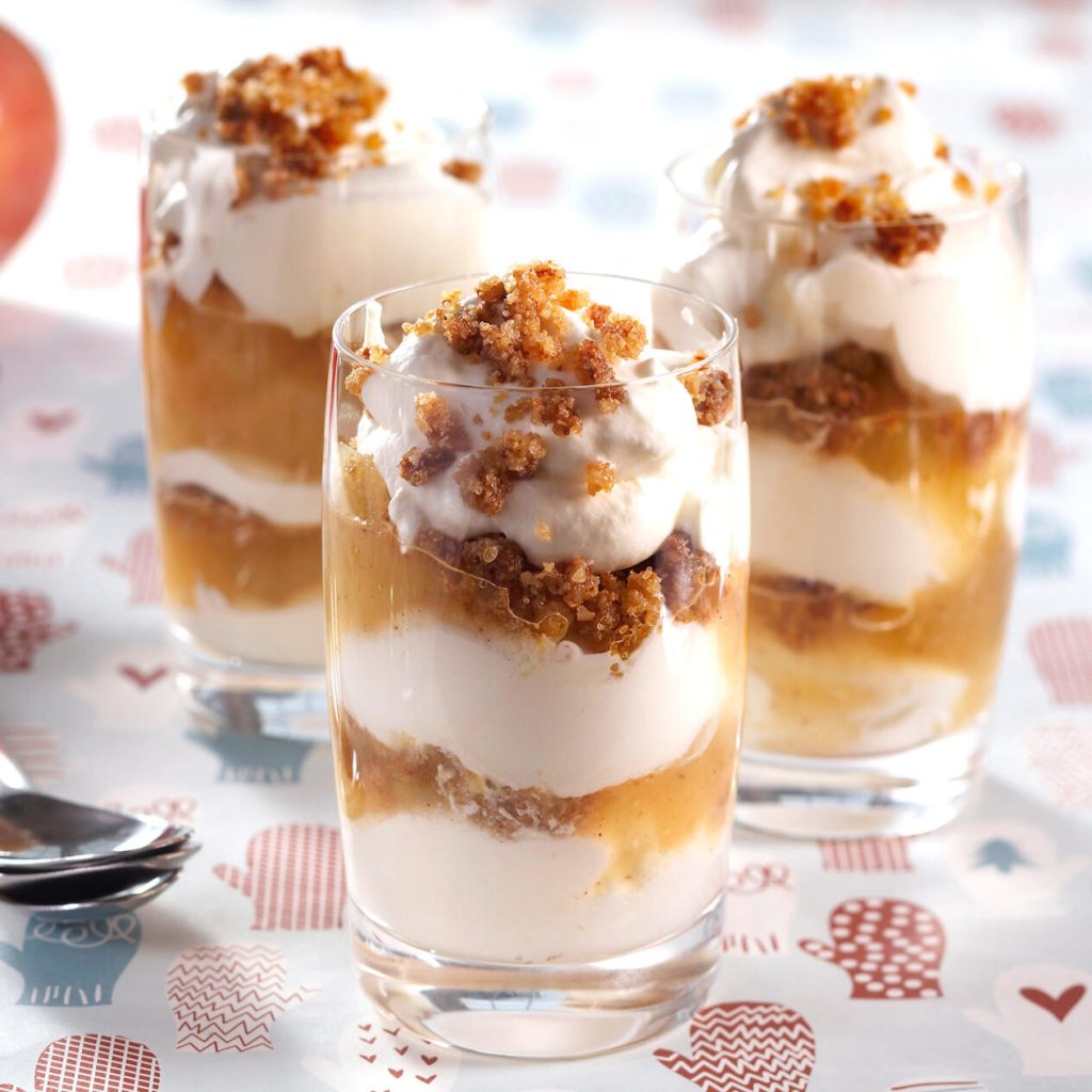 Vispa grädden fluffig men inte för hård. Varva äppelmos, grädde och kaksmulor i glas och servera genast.