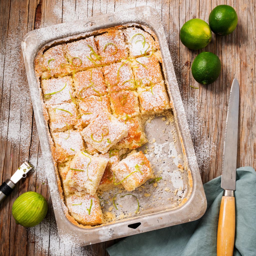 Pudra med florsocker och riv över limeskal. Skär i rutor och servera.