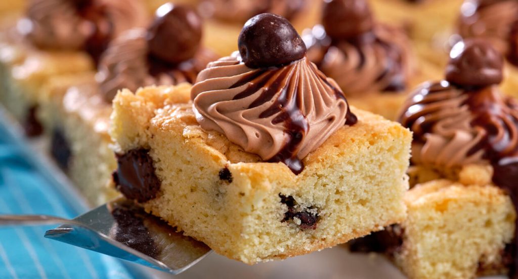 Skär kakan i rutor. Vispa upp godisfluffet och spritsa eller klicka på kakorna. Smält ihop hasselnötskräm (Nutella) och grädde under omrörning och ringla över kakorna. Garnera med Polly.