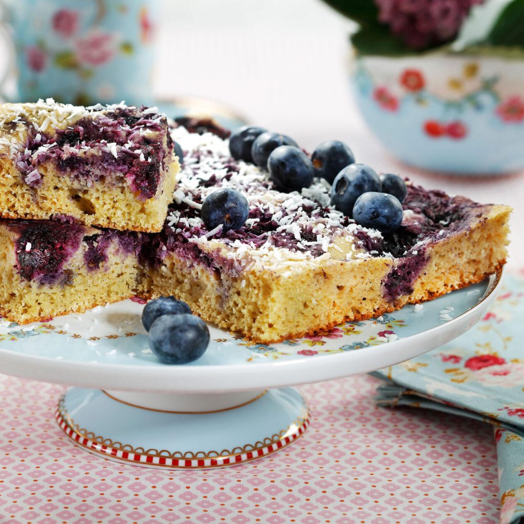 Häll smeten i en smord långpanna och fördela blåbären över. Strössla över kokos.