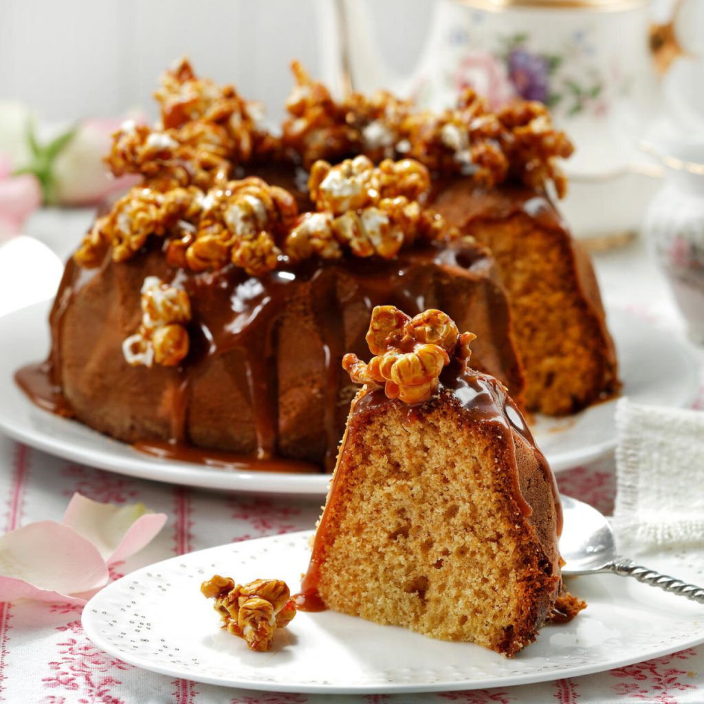 Före servering: Häll glasyren över kakan. Toppa med popcornen.