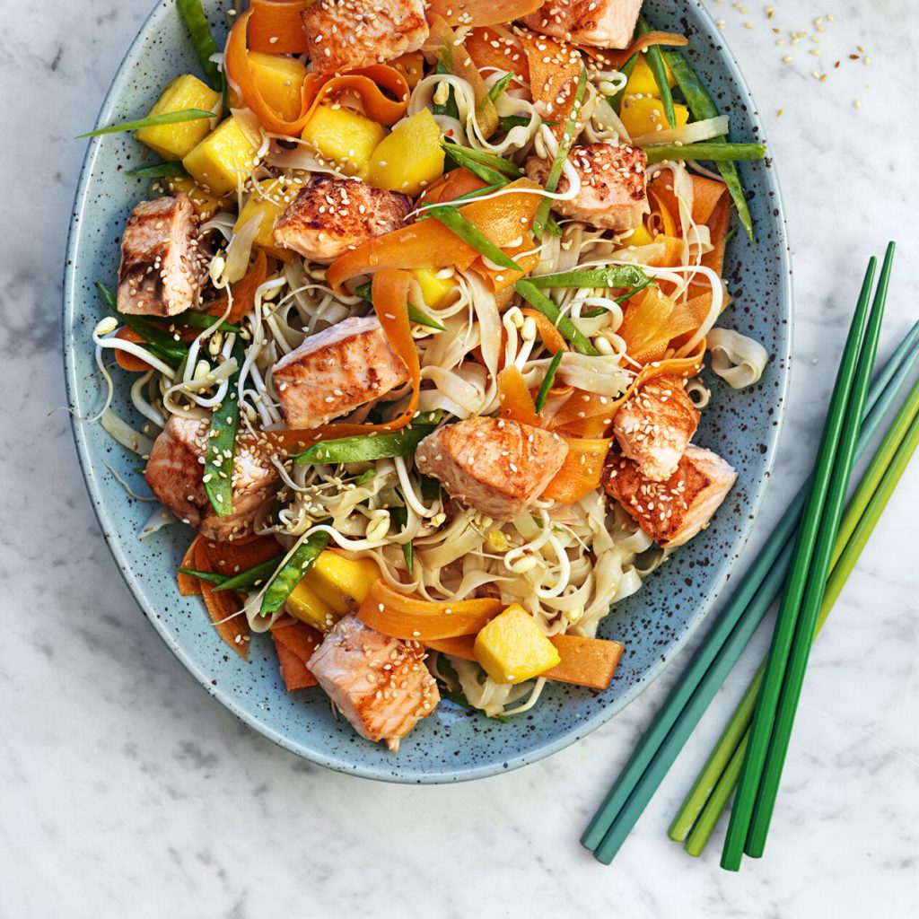Vänd runt nudlar, morötter, sockerärter, groddar och mango med dressingen. Smaka av med salt.