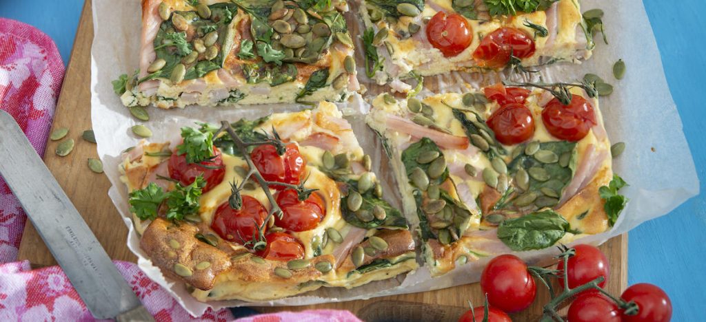 Vispa samman ägg, grädde, crème fraiche, ost, persilja, salt och peppar och häll i formen. Lägg i tomater och strö över pumpakärnor.