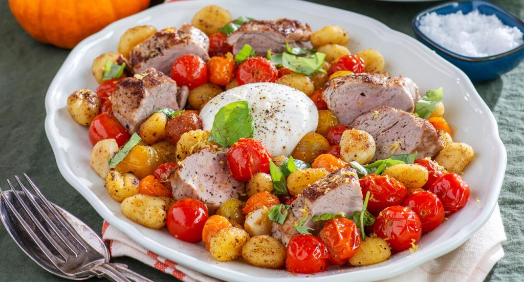 Häll olja i pannan och stek gnocchin på ganska hög värme tills den fått fin färg. Krydda med salt och peppar och lägg tillbaka tomaterna.