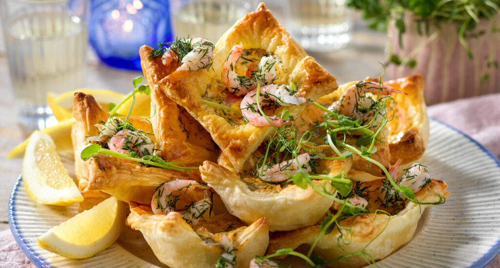 Garnering: Blanda resterande räkor med hackad dill och lägg på pastejerna. Toppa med dillvippor, citronskal och ärtskott.