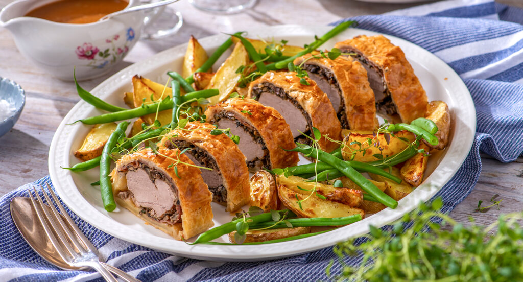 Rulla ut smördegen. Bred senapen på köttet. Lägg ut skinkskivorna på plastfolie och bred på svampfyllningen. Lägg på köttet. Rulla skinkskivorna runt köttet.