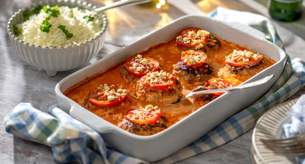 Häll såsen runt biffarna och gratinera i 25 minuter.