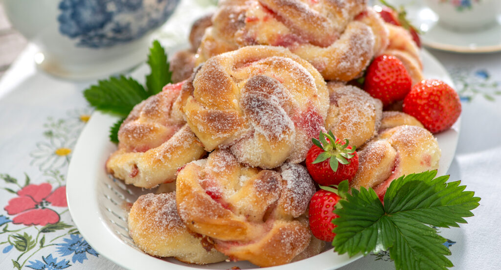 Sylt: Rensa och dela jordgubbarna. Koka upp tillsammans med syltsocker och citronsaft. Låt småkoka i 10 minuter. Låt kallna.