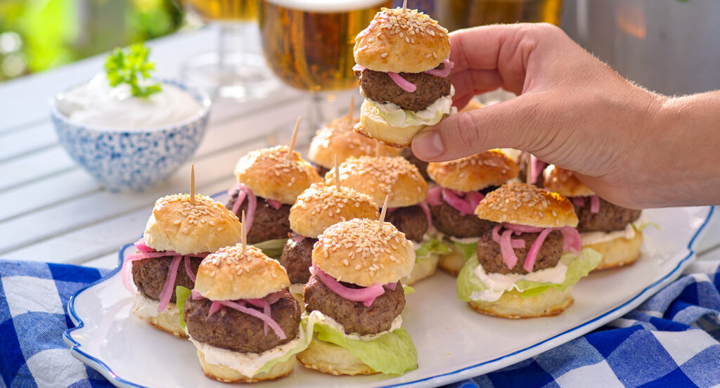 Servering: Dela bröden. Lägg salladsblad på bottendelarna. Klicka på dressing, lägg på burgaren. Toppa med picklad lök. Sätt på locket och fäst med ett träspett.
