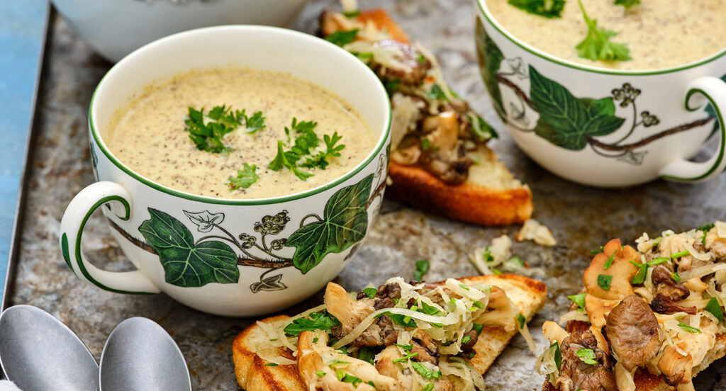 Lägg upp svampfräset på brödskivorna och servera till soppan.