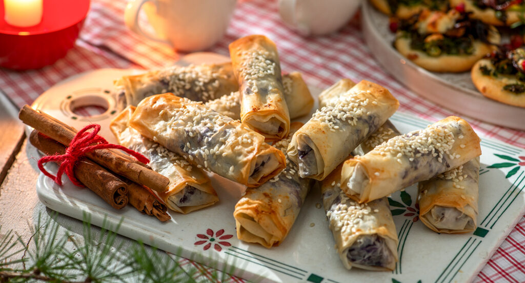 Dela varje filodegsark i fyra bitar. Lägg knappt 2 msk fyllning längs ena kortsidan. Vik in långsidornas kanter och rulla ihop.