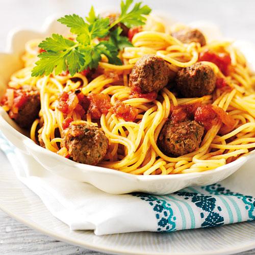 Pasta med tomatsås och köttbullar