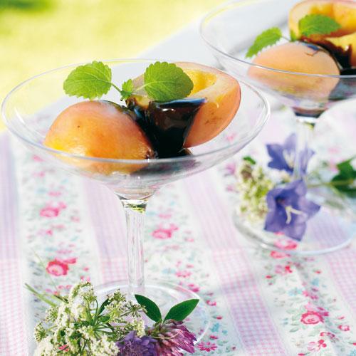Inkokt persika med kolasås