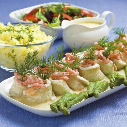Pocherade fiskrulader med rökt lax och vitvinssås