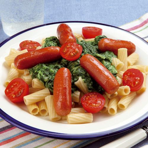 Pasta med spenatsås och prinskorv