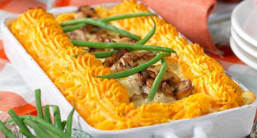 Festlig fiskgratäng med räksås och champinjoner