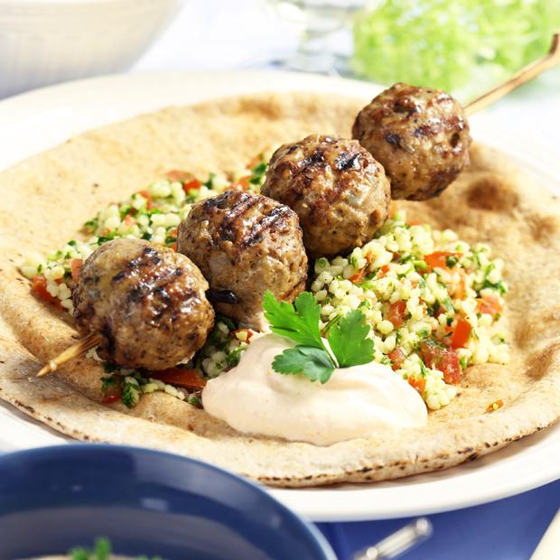 Grillade marockanska köttbullar med tabouleh och yoghurtsås