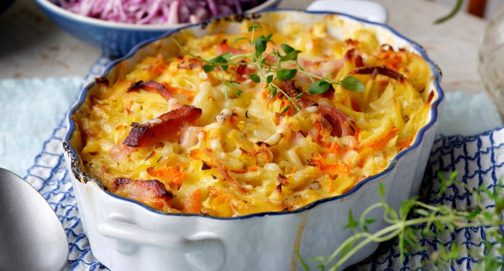 Gratäng med rotfrukter och kassler