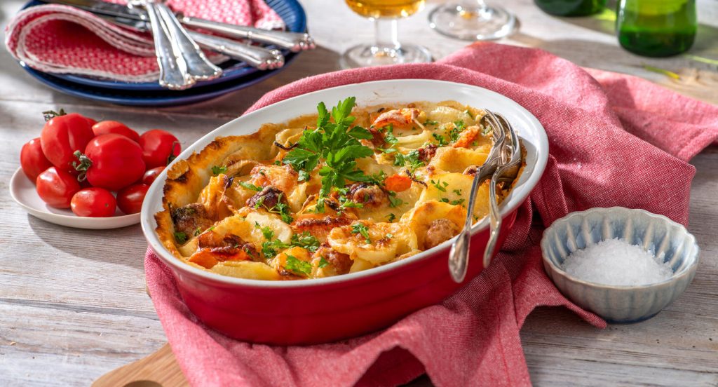 Potatisgratäng med kryddig korv