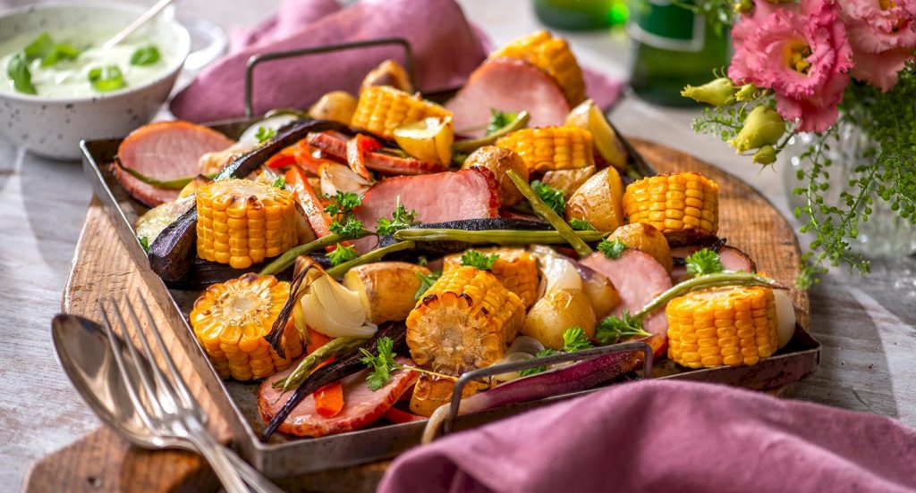 Kasslerplåt med grönsaker och örtsås