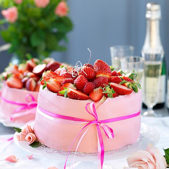 Bröllopstårta med jordgubbs- och flädermousse