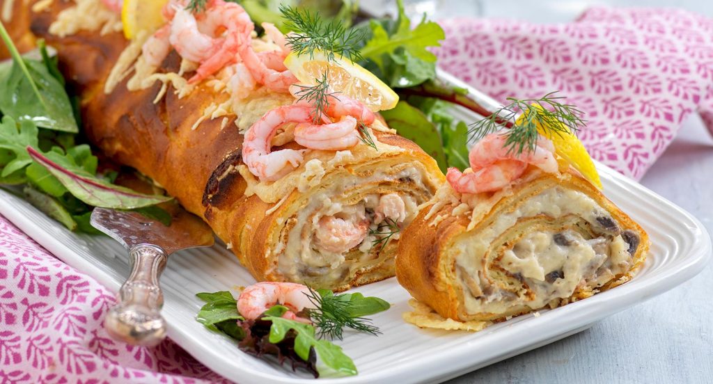 Pannkaksrulle med krämig svamp- och räkstuvning