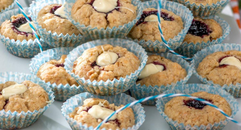 Havrekakor med hallonsylt och vit choklad