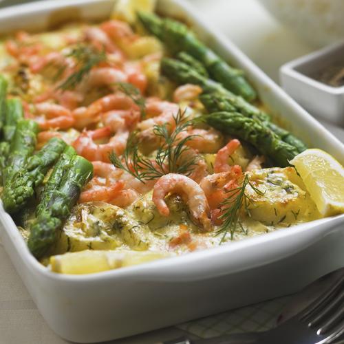 Festlig fiskgratäng med rödtunga och räkor