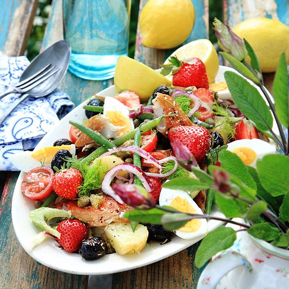 Sallad Niçoise med makrill och jordgubbar