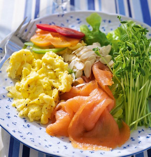Äggröra med rökt lax och ärtskott