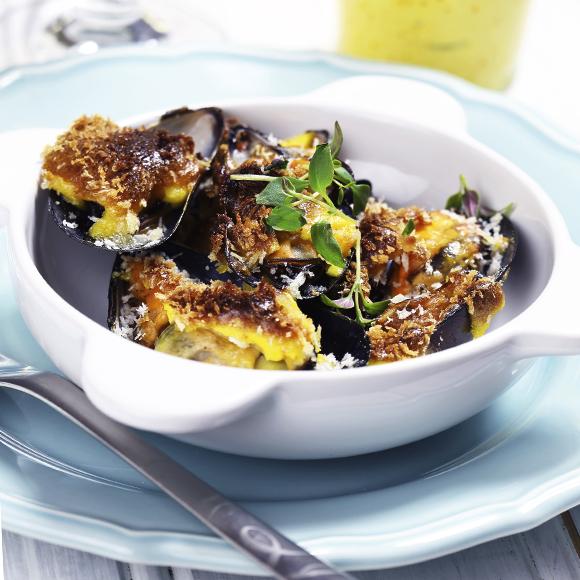 Pankogratinerade blåmusslor med saffransmajonnäs