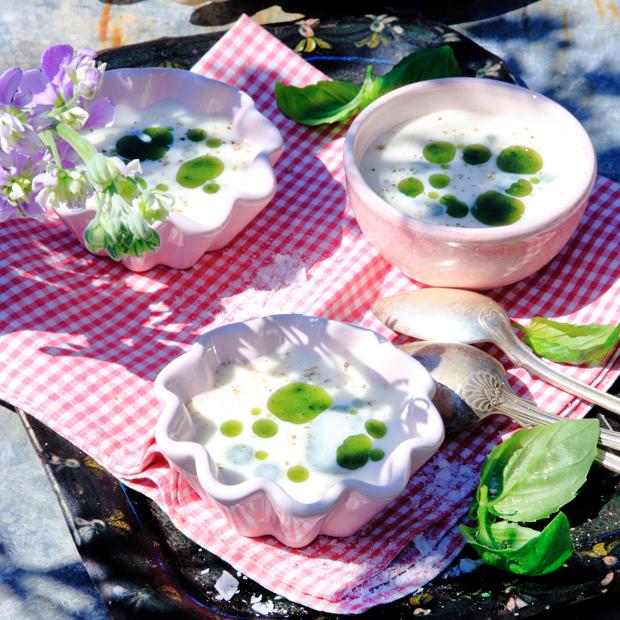 Vit sparrissoppa med basilikaolja
