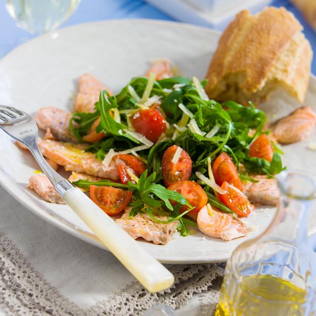 Halstrad tunnskivad lax med rucolasallad