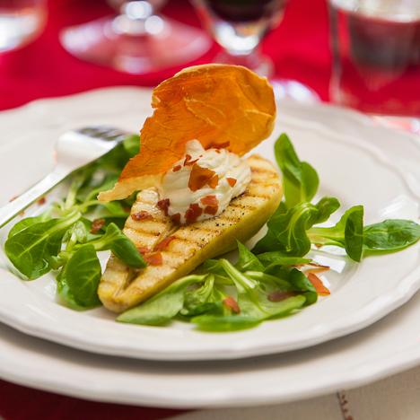 Grillat päron med chèvrekräm och parmachips