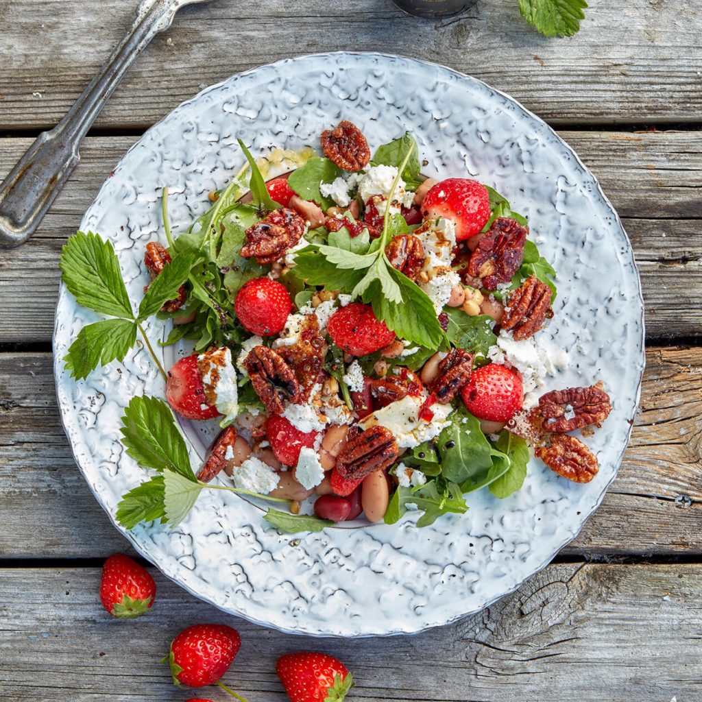 Jordgubbssallad med getost och kanderade nötter