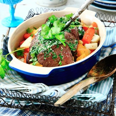 Oxfilé provençal på rotfruktsbädd