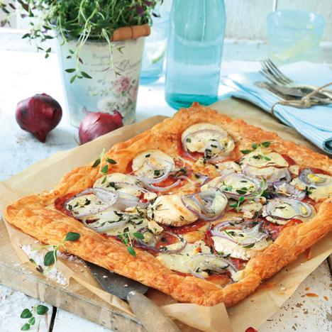 Chèvretartelette med salami och lök