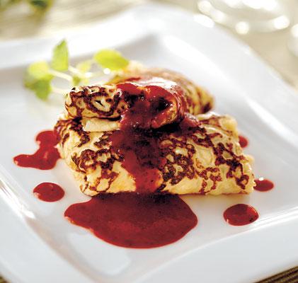 Apelsincrêpes med jordgubbssås
