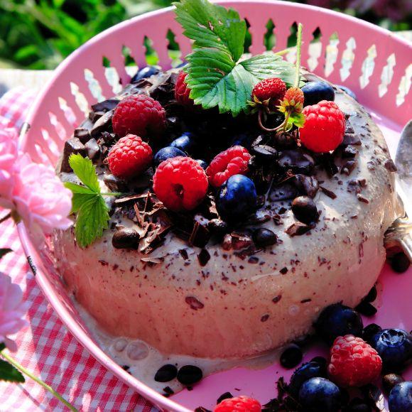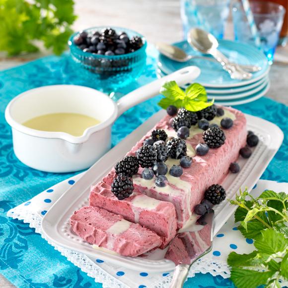 Björnbärsglass med vit chokladsås
