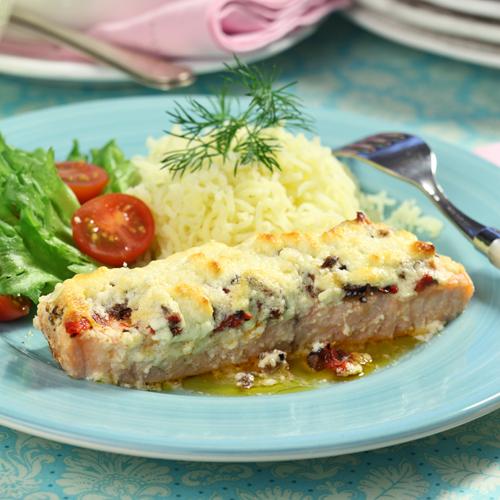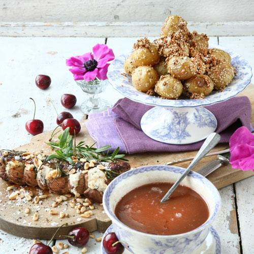 Getostfylld fläskfilé med körsbärssås och sesamstekt potatis