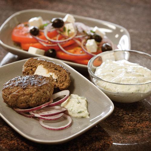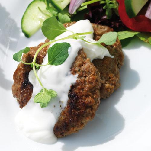 Grekiska färsbiffar med tzatziki och tomatsallad