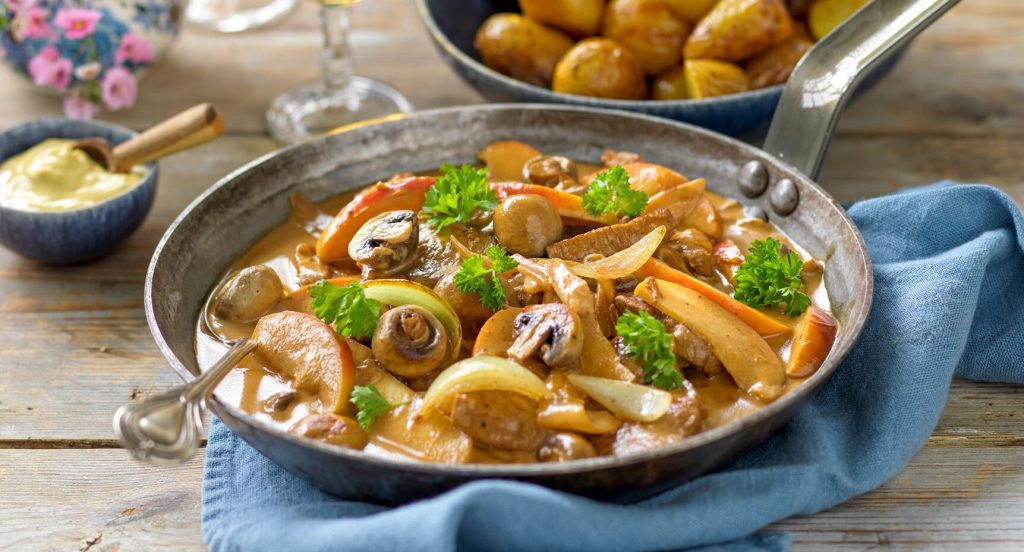 Fläskfilégryta med svamp och äpple