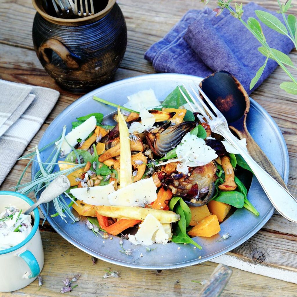 Rotfruktssallad med kantareller och rensteksröra