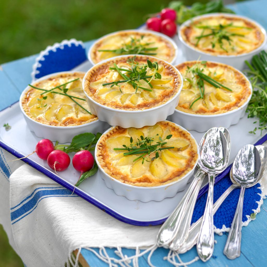 Minipajer med färskpotatis och varmrökt lax