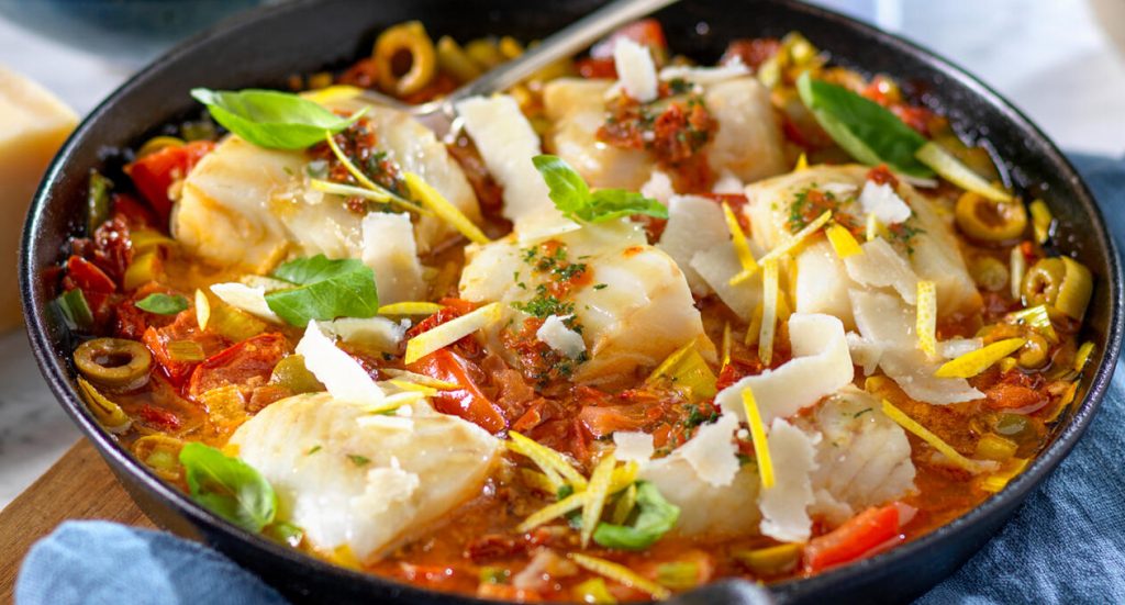 Italiensk torskpanna med soltorkade tomater