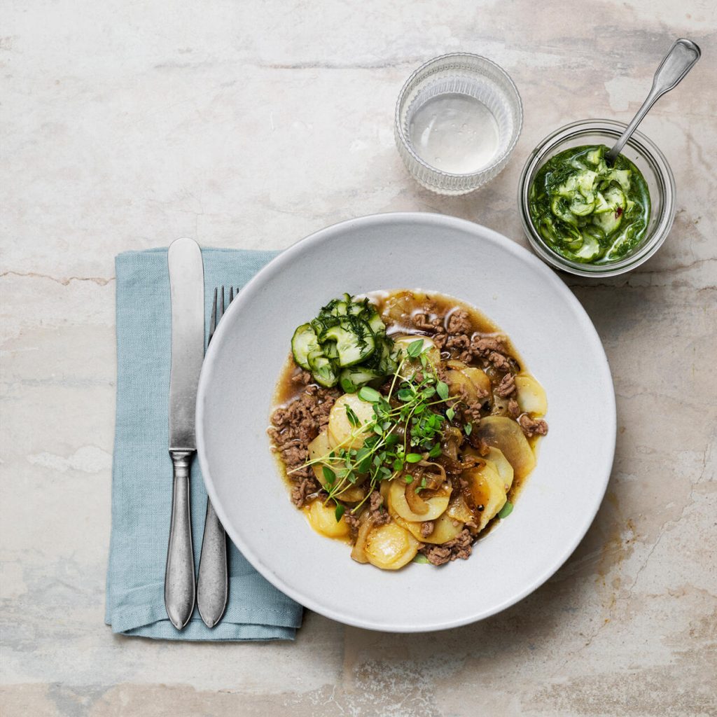 Sjömansbiff på nötfärs med dillinlagd gurka