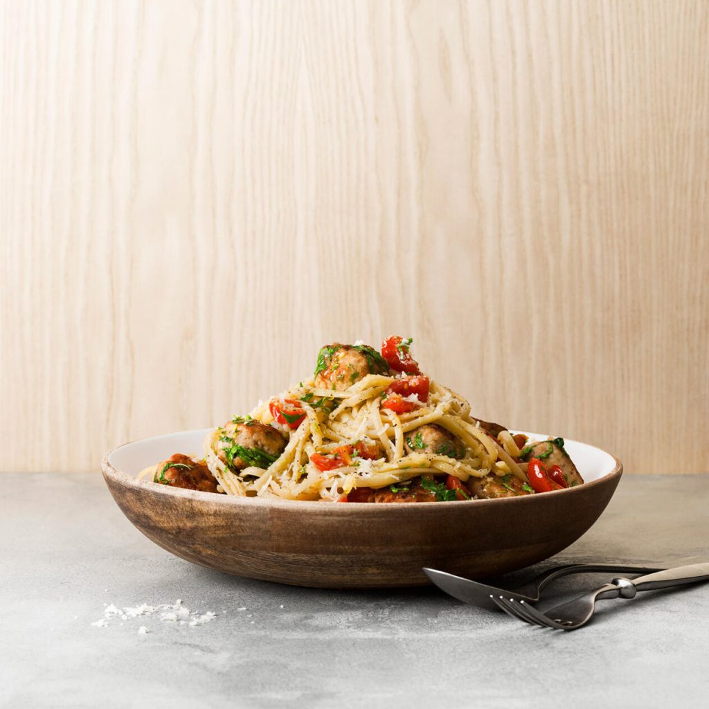 Spagetti med kycklingbönbollar, tomat, persilja och vitlök