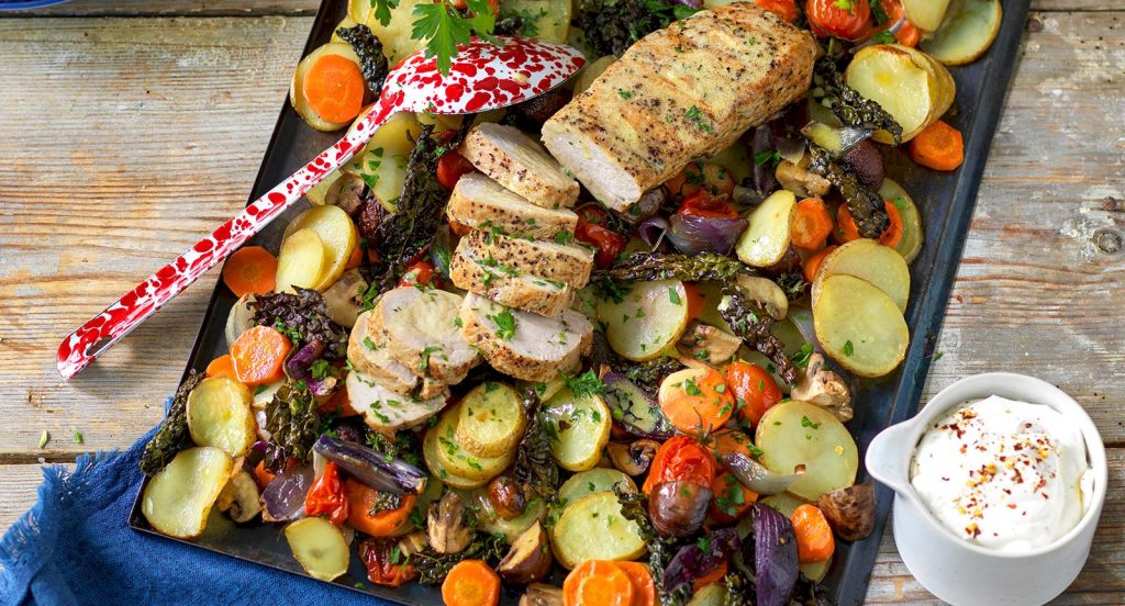 Fläskytterfilé med rostade grönsaker och vispad crème fraiche