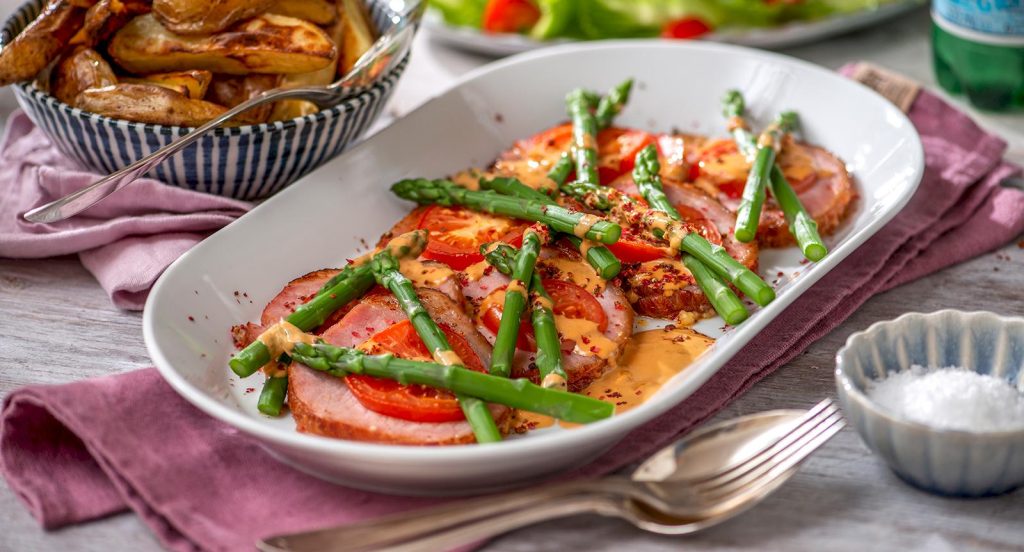 Kasslerplåt med grönsaker och örtsås