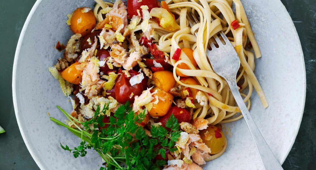 Linguine med varmrökt lax